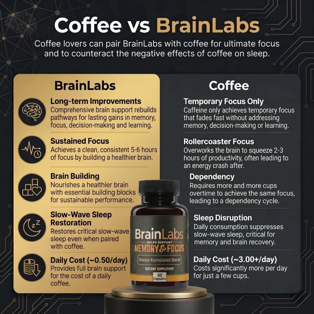 Your daily cup of coffee gives you a focus boost by overworking your brain and depleting your neurotransmitters for 2-3 hours of focus. BrainLabs works by improving your overall brain health and neural pathways for long-term improvements in focus, memory, processing speed, and every other brain function. Coffee lovers can also take 1 capsule of BrainLabs with their coffee in order to counteract the negative effects of coffee on slow-wave sleep.