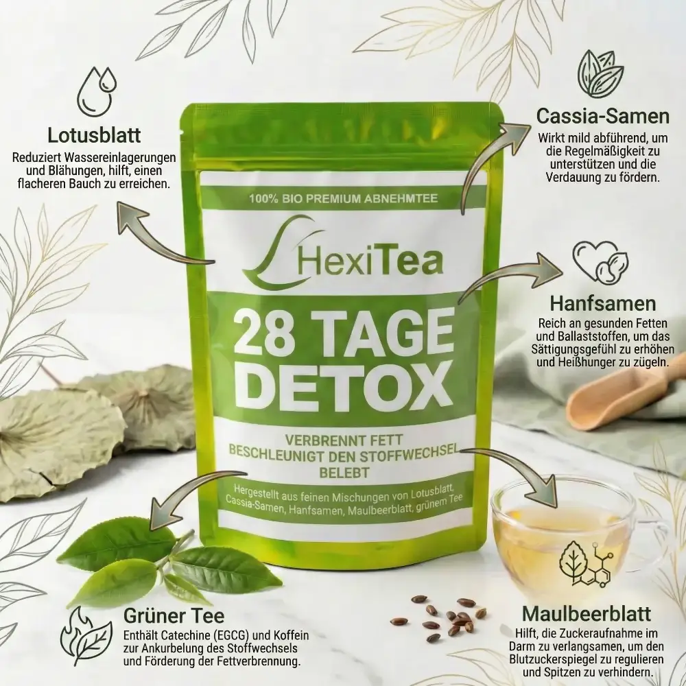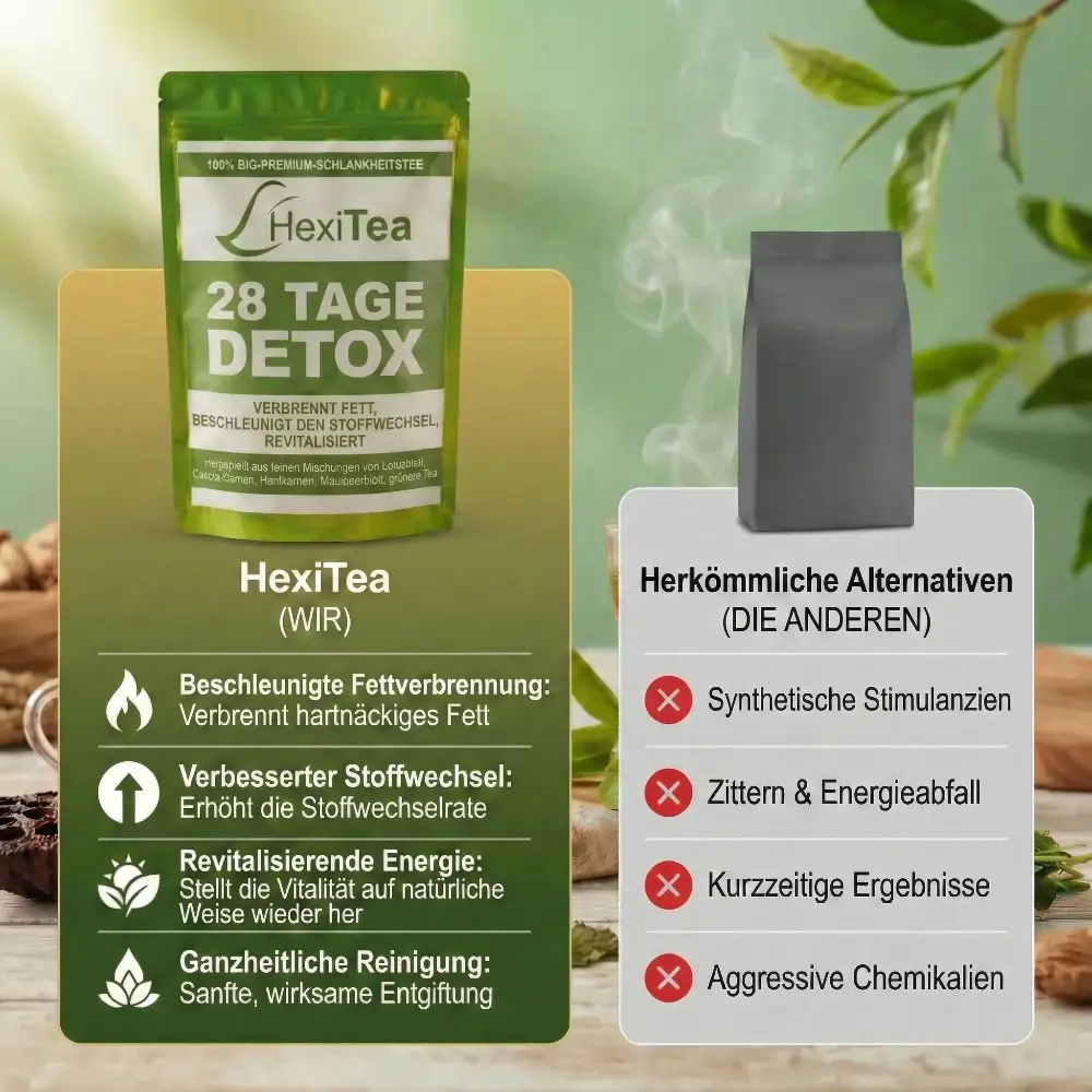 Die drei wichtigsten Vorteile der Verwendung von HexiTea sind: 1. Verbesserter Stoffwechsel, der zu Gewichtsverlust und besserer Energie führt 2. Ganzkörperentgiftung von Schwermetallen und Toxinen 3. Reinigung des Verdauungssystems und weniger Blähungen