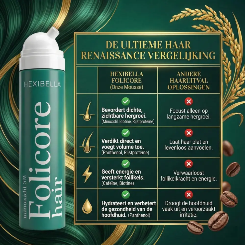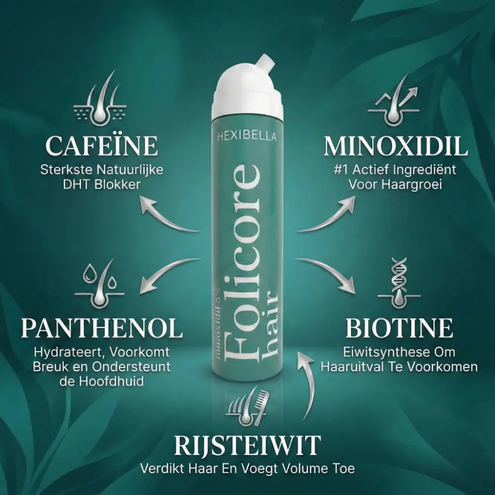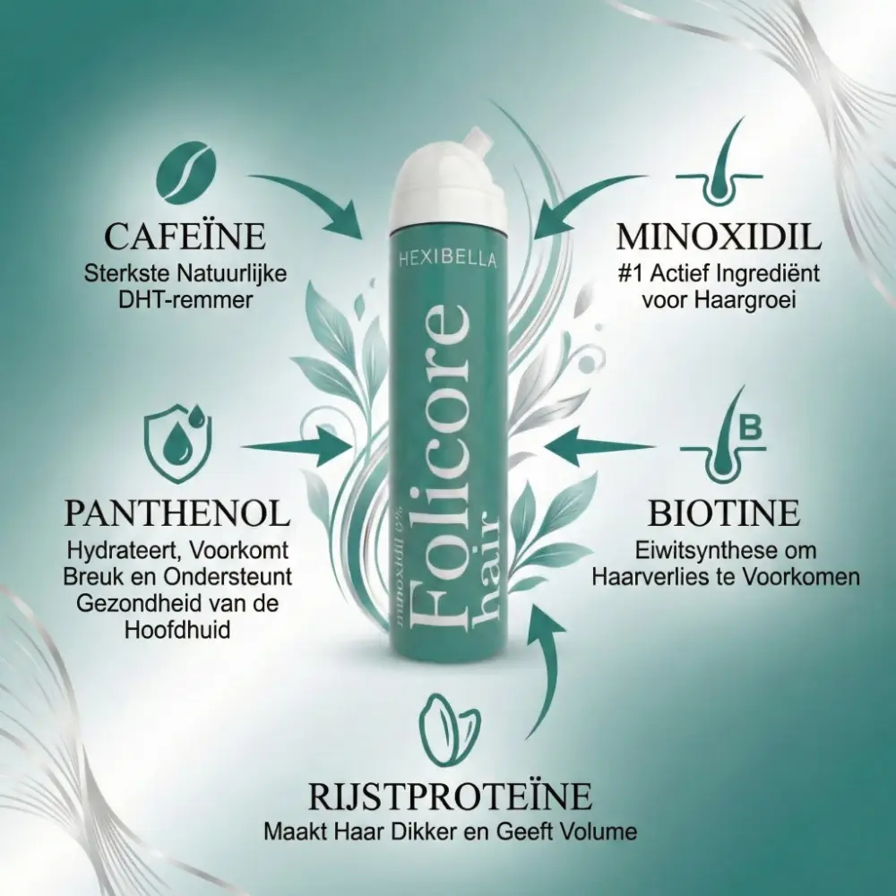 De 5 belangrijkste ingrediënten zijn: 1. Minoxidil 2. Cafeïne 3. Biotine 4. Rijst Proteïne 5. Panthenol. We gebruiken nog andere ingrediënten om de mousse te maken, zoals ethanol, maar die zijn medisch gezien niet belangrijk.